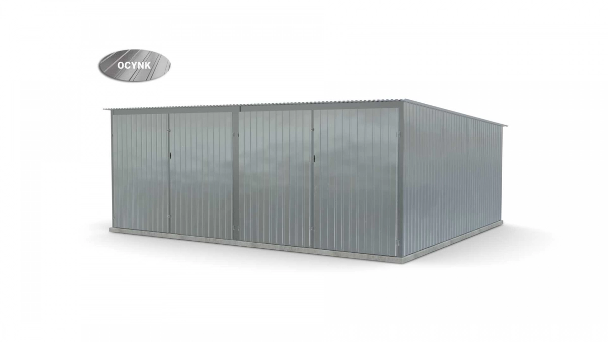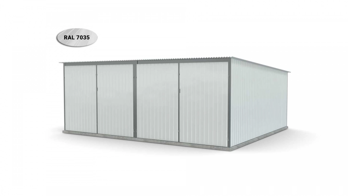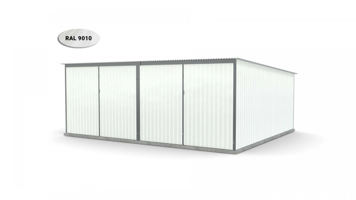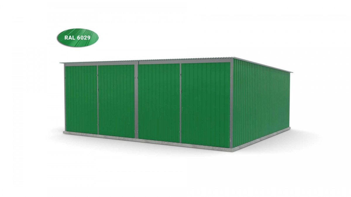 <p>Stalen garage met afmetingen <strong>5,9 m x 5 m</strong> <strong>(dubbel) - </strong>2 dubbele draaipoorten en dakhelling naar achteren. De constructie is gemaakt van koudgevormde <strong>gegalvaniseerde</strong> hoekprofielen. De wanden van de garage zijn bedekt met gegalvaniseerd plaatstaal (trapeziumprofiel T-7), het dak is bedekt met gegalvaniseerd plaatstaal (trapeziumprofiel T-12). De platen worden met klinknagels aan de constructie bevestigd, terwijl de prefab elementen met bouten aan elkaar worden geschroefd. De garage is standaard uitgerust met 2 dubbele draaipoorten met twee grendels en een cilinderslot met sleutel.</p>