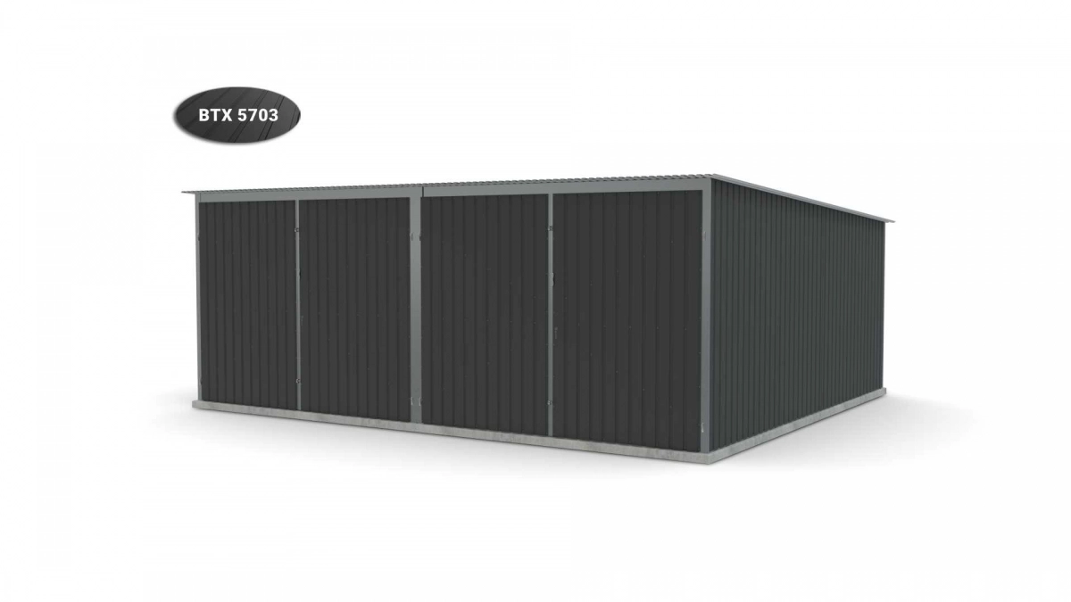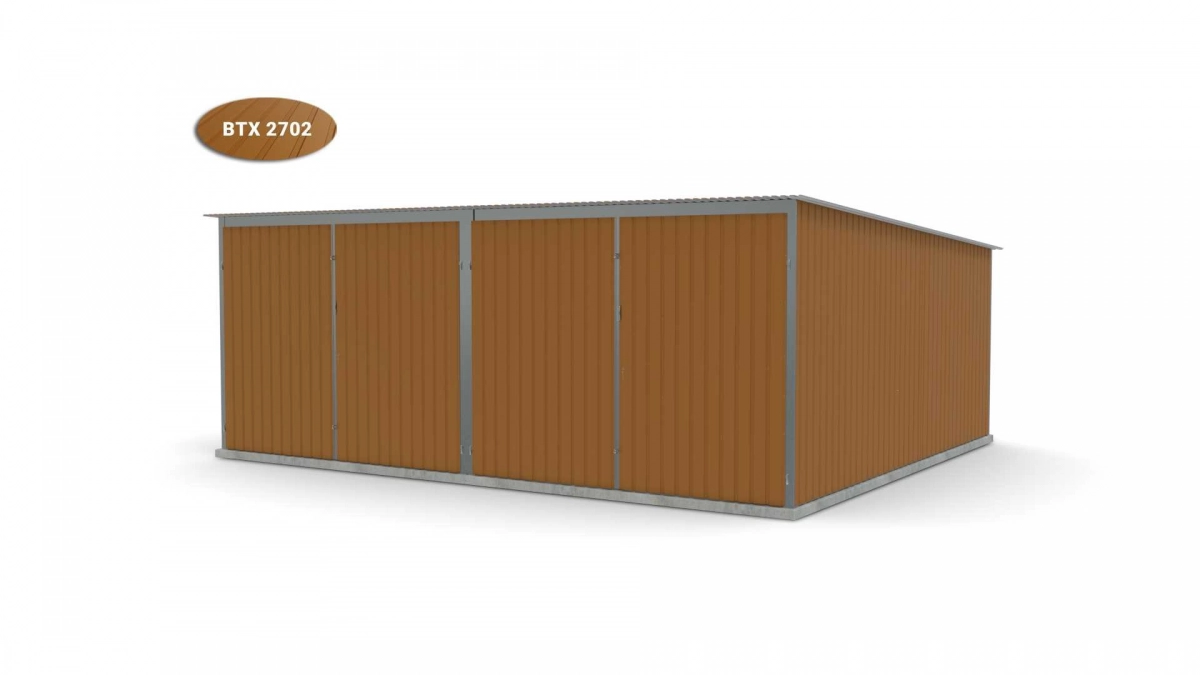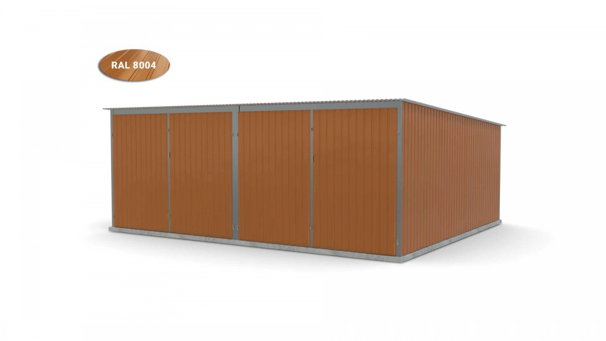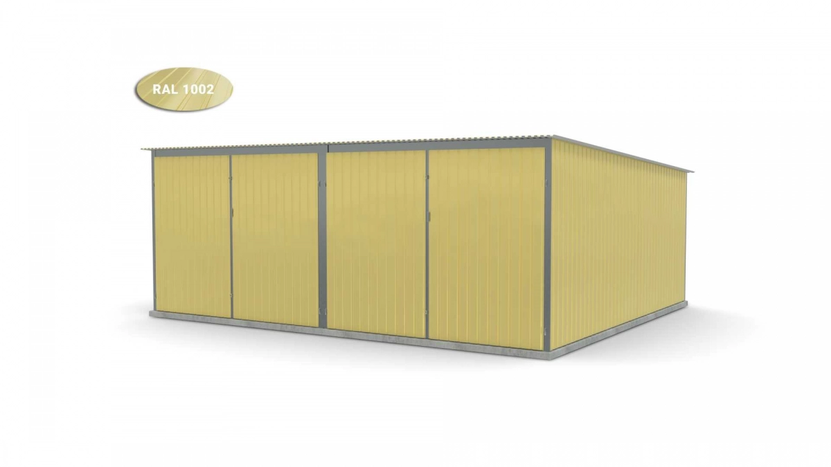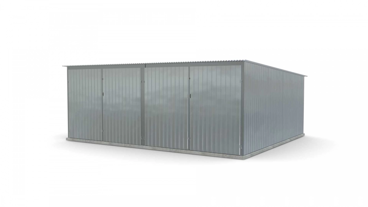 <p>Stalen garage met afmetingen <strong>5,9 m x 5 m</strong> <strong>(dubbel) - </strong>2 dubbele draaipoorten en dakhelling naar achteren. De constructie is gemaakt van koudgevormde <strong>gegalvaniseerde</strong> hoekprofielen. De wanden van de garage zijn bedekt met gegalvaniseerd plaatstaal (trapeziumprofiel T-7), het dak is bedekt met gegalvaniseerd plaatstaal (trapeziumprofiel T-12). De platen worden met klinknagels aan de constructie bevestigd, terwijl de prefab elementen met bouten aan elkaar worden geschroefd. De garage is standaard uitgerust met 2 dubbele draaipoorten met twee grendels en een cilinderslot met sleutel.</p>