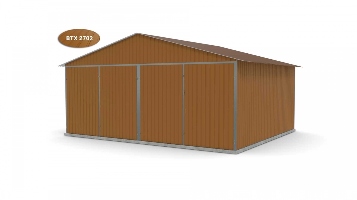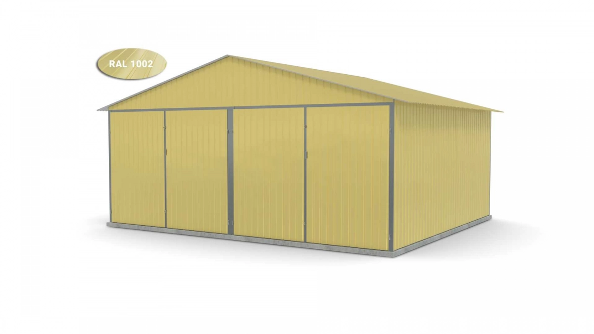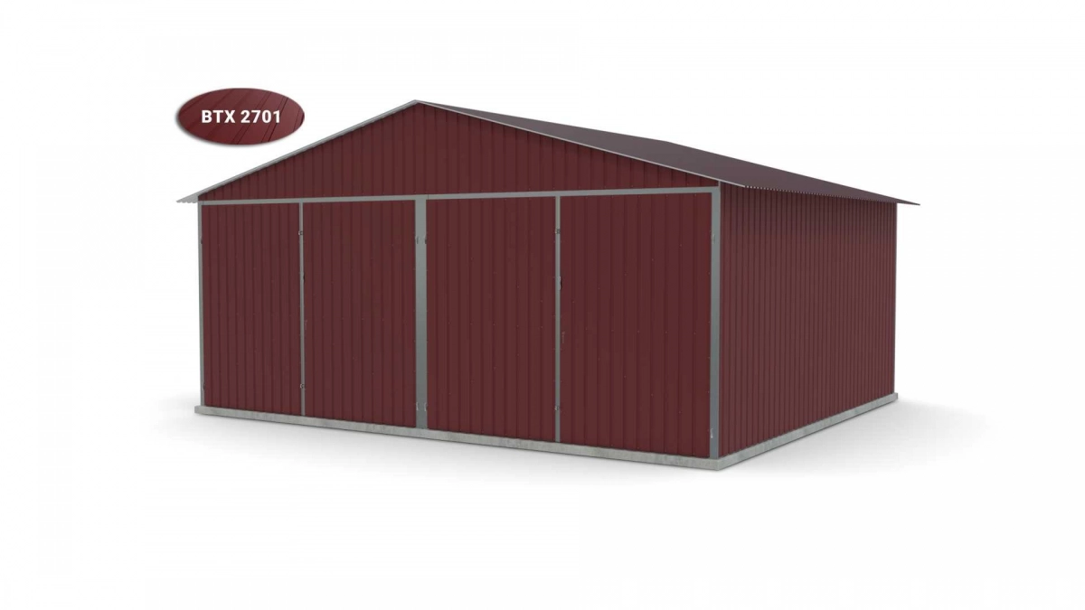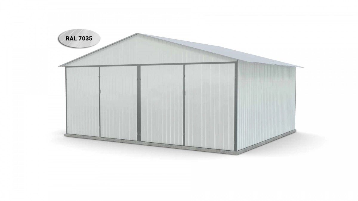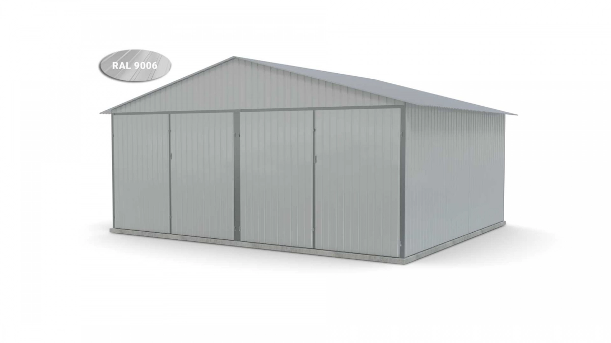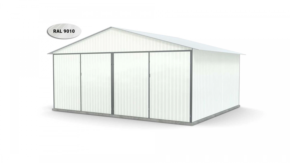 <p>Stalen garage met afmetingen <strong>5,9 m x 5 m</strong> <strong>(dubbel) - </strong>2 dubbele draaipoorten en zadeldak. De constructie is gemaakt van koudgevormde <strong>gegalvaniseerde</strong> hoekprofielen. De wanden van de garage zijn bedekt met gegalvaniseerd plaatstaal (trapeziumprofiel T-7), het dak is bedekt met gegalvaniseerd plaatstaal (trapeziumprofiel T-12). De platen worden met klinknagels aan de constructie bevestigd, terwijl de prefab elementen met bouten aan elkaar worden geschroefd. De garage is standaard uitgerust met 2 dubbele draaipoorten met twee grendels en een cilinderslot met sleutel.</p>
